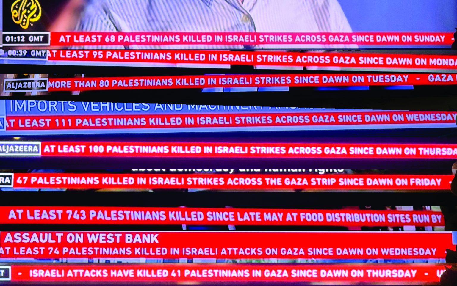 Because we have committed so many atrocities and allowed unthinkable evil to fester, we think we can atone for our deeds by accommodating, sponsoring, and abetting the devil. In June of 2025, I noticed the news ticker on the Al Jazeera channel had an item that provided an update on the number of people (mostly women and children) killed daily by Israeli attacks on Gaza. After observing for about a week, I began taking pictures of these updates.